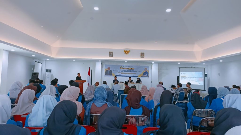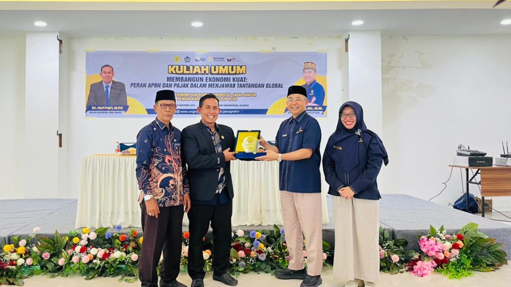 FEB Unigha – Fakultas Ekonomi dan Bisnis Universitas Jabal Ghafur menyelenggarakan Kuliah Umum bertema “Membangun Ekonomi Kuat: Peran APBN dan Pajak dalam Menjawab Tantangan Global” pada Rabu, 19 November 2025, bertempat di Aula Gedung Nurdin Abdurrahman. Acara yang berlangsung sejak pukul 09.30 WIB ini dihadiri oleh lebih dari 150 peserta, terdiri dari mahasiswa tiga program studi, dosen, tenaga kependidikan, serta unsur pimpinan fakultas.